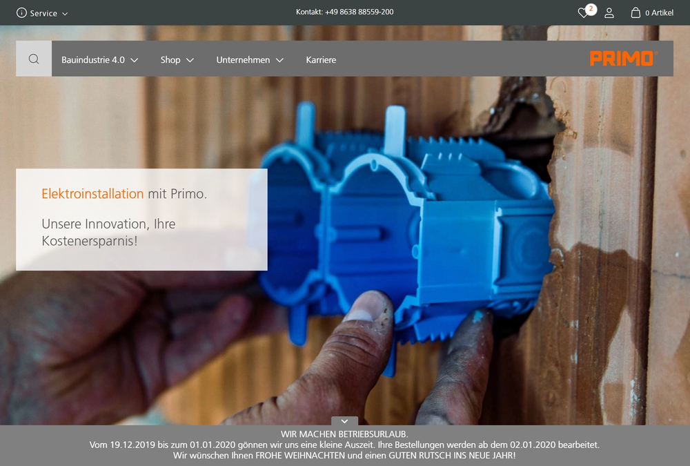 Primo ist ein junges Unternehmen aus Oberbayern. Ihr Motto: Neue und innovative Elektroartikel sollen in der hart umkämpften Elektroinstallationsbranche helfen, Zeit und Kosten zu sparen. Zu Primos Produktsortiment gehören u. a. Betondosen bzw. Flügelbetondosen, Schalterdosen und Unterputzdosen mit oder ohne Schutzkappe bzw. Silikonschutzkappe sowie Einziehgeräte bzw. Einblasgeräte und die dazu passende Kabelwinde, außerdem viel Befestigungstechnik bzw. Befestigungsmaterial. Zur effektiven Problemlösung für die Elektroinstallation trägt sämtliches Elektroinstallationsmaterial aus unserer Produktion bei.